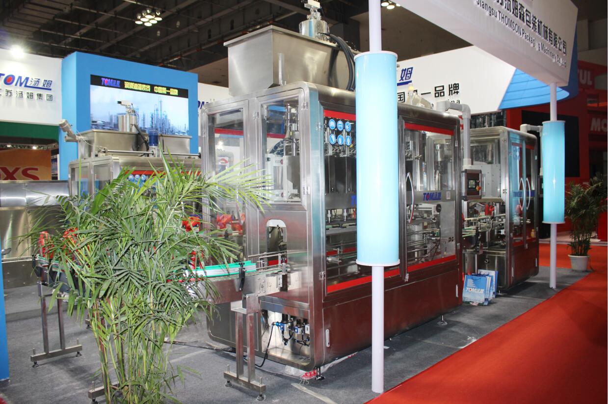 江蘇湯姆集團(tuán)在展會(huì)現(xiàn)場(chǎng)展示了全自動(dòng)稱(chēng)重灌裝機(jī)、稱(chēng)重式灌裝旋蓋一體機(jī)、快裝式全自動(dòng)回轉(zhuǎn)式旋蓋機(jī)、廣口桶稱(chēng)重灌裝機(jī)、廣口桶壓蓋機(jī)、噸桶稱(chēng)重灌裝機(jī)、開(kāi)箱機(jī)、裝箱機(jī)、封箱機(jī)、供棧機(jī)、抓桶碼垛機(jī)等多系列包裝機(jī)械產(chǎn)品。