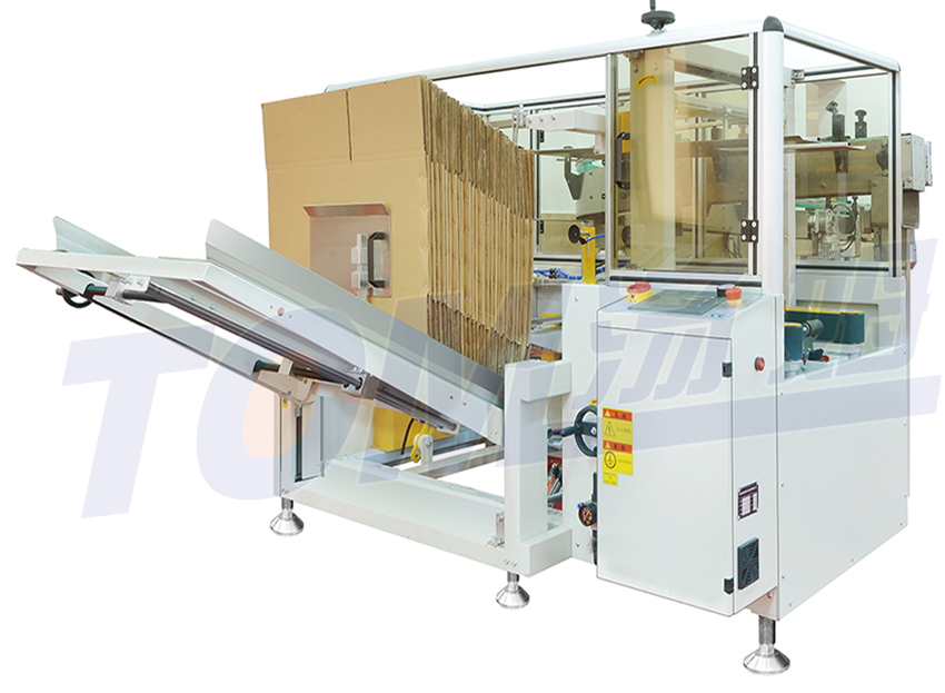 自動完成開箱、成形、下底折葉折曲。并實同時完成下部分膠帶黏貼, 將疊成紙板的箱板自動打開,箱子底部按一定程序折合,并用膠帶密封后輸送裝箱機的專用設備。自動開箱機是大批量紙箱自動開箱、自動折合下蓋、自動密封下底膠帶的流水線設備,本機采用PLC顯示屏控制,大大方便操作、管理、減少生產人員和勞動強度,是自動化規模生產必不可少的設備。操作方便,降低包裝成本。
